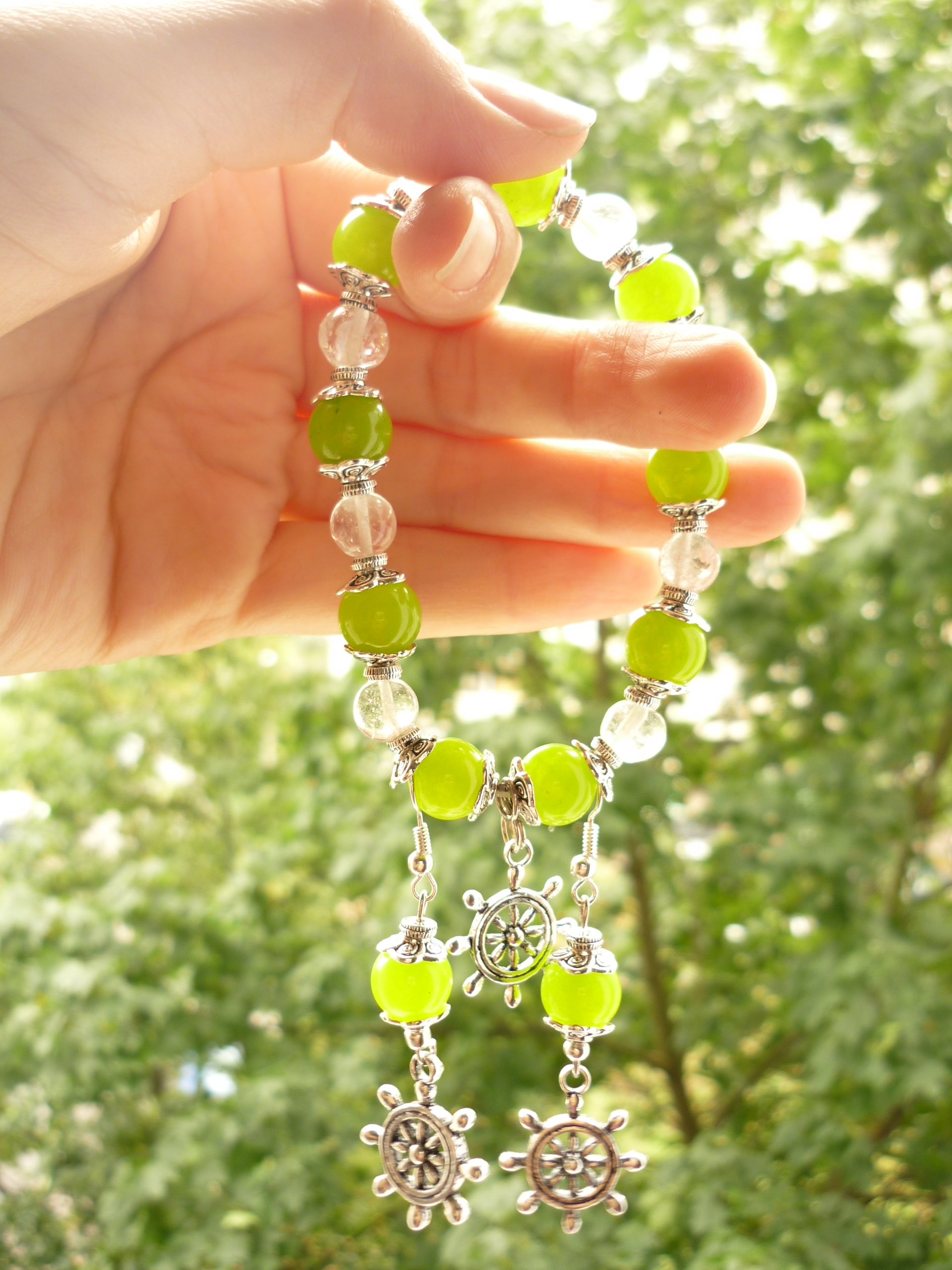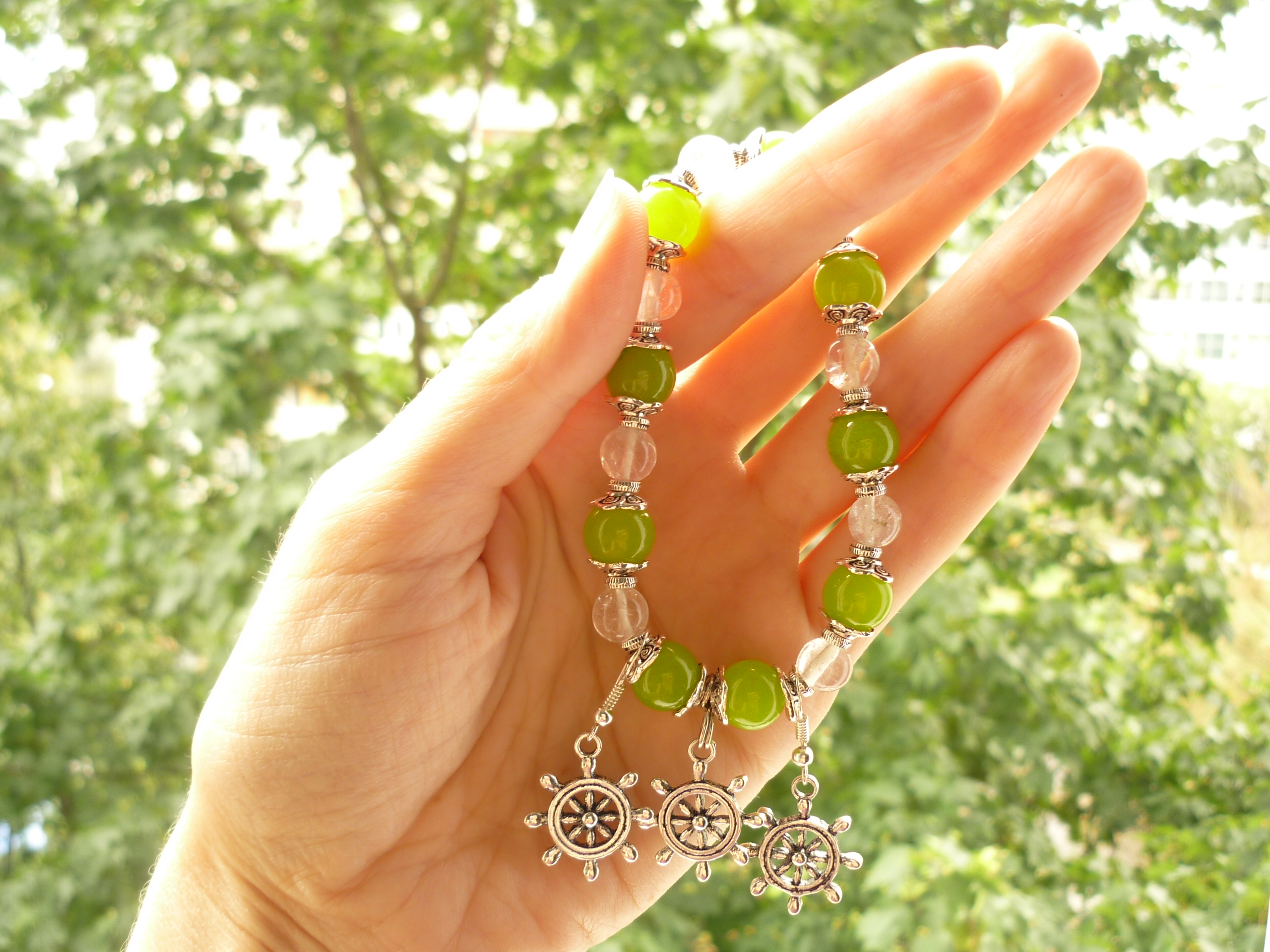 Браслет с колесом фортуны - символизирует «Движение», помогает человеку выбраться из любой жизненной ситуации "застоя, тупика, безвыходности". Бусины из цветного стекла: зелёный цвет символизирует богатство, исцеление от болезней и плодородие. Женщинам, которые имеют проблемы с зачатием, следует обратиться за помощью к этому цвету. Желтый символизирует интеллект и силу мысли. Он обычно используется, чтобы помочь убедить кого-то в своей правоте. Желтый - цвет радости, для предотвращения состояния депрессии и тревоги. Украшение для всех бизнес - леди приносит удачу и движение в любой деятельности.