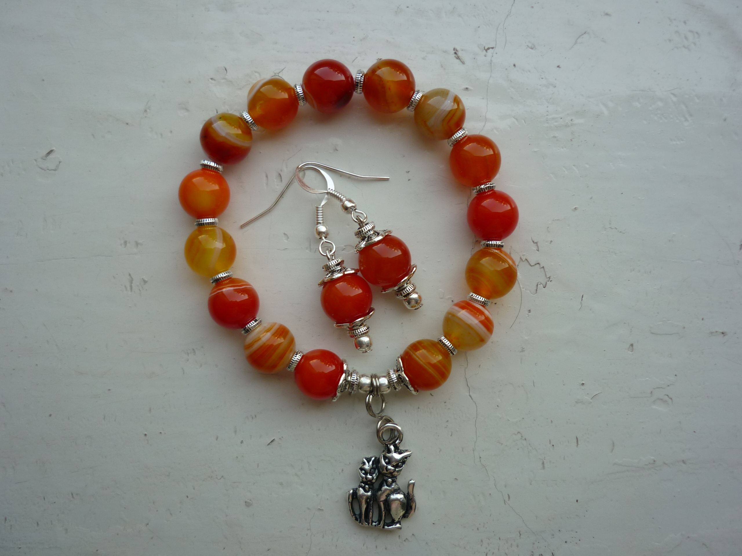 Браслет из бусин агата (слоисто оранжевого). Агат заряжает супругов мощной положительной энергетикой, разжигая любовь всё ярче и жарче, помогает понимать и уважать друг друга, оберегать друг друга от неприятностей. Чувства разгораются с новой силой, супруги вновь переживают медовый месяц. Не случайно агатовая свадьба празднуется на 14 году совместной жизни. В старину к агату относились очень серьезно. Знахари заставляли женщин и мужчин носить этот камень, если распадался брак. Его вправляли в оправу и носили как талисман. Агат красного - оранжевого цвета необходимо носить женатым парам для укрепления семейных уз.