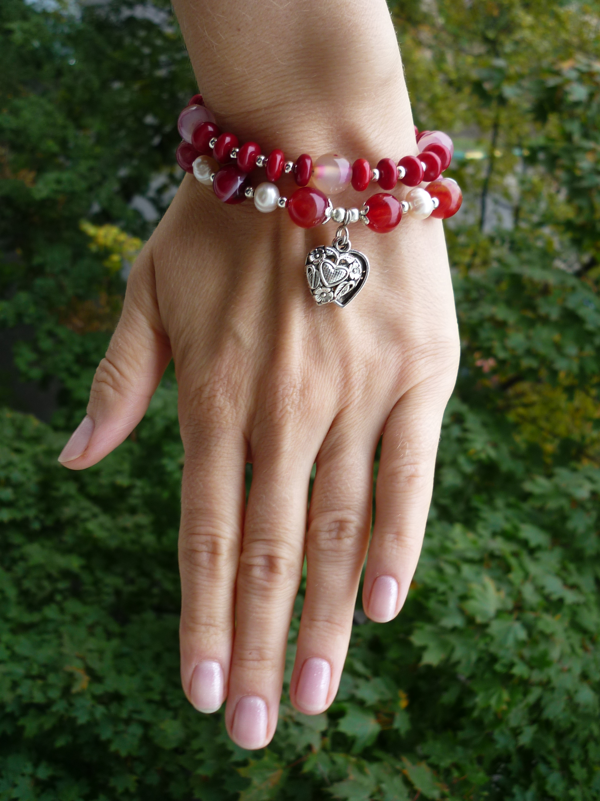 Винтажный браслет с сердцем для взаимной любви. Украшение выполнено из бусин жемчуга, красного полосатого агата и яркого коралла. Красный цвет символизирует страсть, смелость, силу, здоровье и сильные эмоции. Бусины слоисто красного агата заряжает влюбленных мощной положительной энергетикой, разжигая любовь всё ярче и ярче, помогает понимать и уважать друг друга, «быть одним целым». Жемчуг- залог верности в любви, защита этой верности, он укрепляет брачные узы и дом. В средние века сложился обычай дарить невесте в день бракосочетания нитку жемчуга, так, как считалось, что он укрепляет любовь избранницы и гарантирует её верность. Это должны были делать либо молодой супруг, либо его родители. Данное украшение станет прекрасным подарком любимому человеку - на соединение и благополучные отношения в паре!
